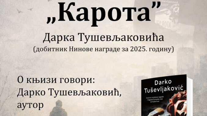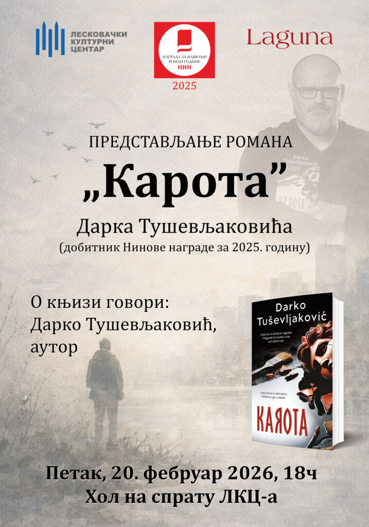 Leskovački kulturni centar sutra, 20. februara 2026. godine, od 18.00 časova, organizuje predstavljanje knjige ,,Karota” autora Darka Tuševljakovića.