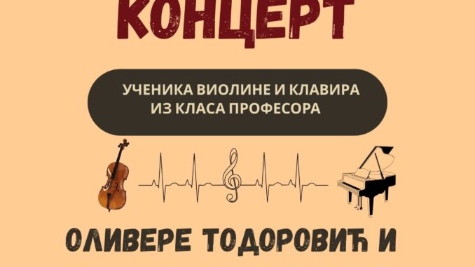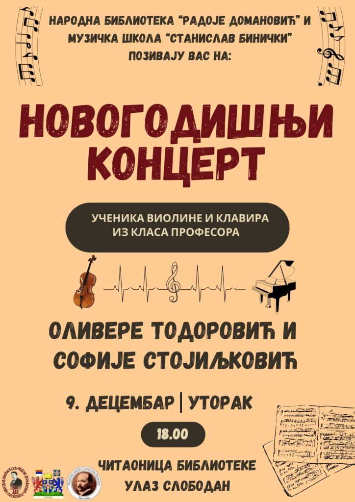 U utorak, 9. decembra 2025. godine u 18.00 sati u čitaonici Narodne biblioteke „Radoje Domanović“ u Leskovcu biće održan Novogodišnji koncert učenika violine i klavira iz klasa profesora Olivere Todorović i Sofije Stojiljković.