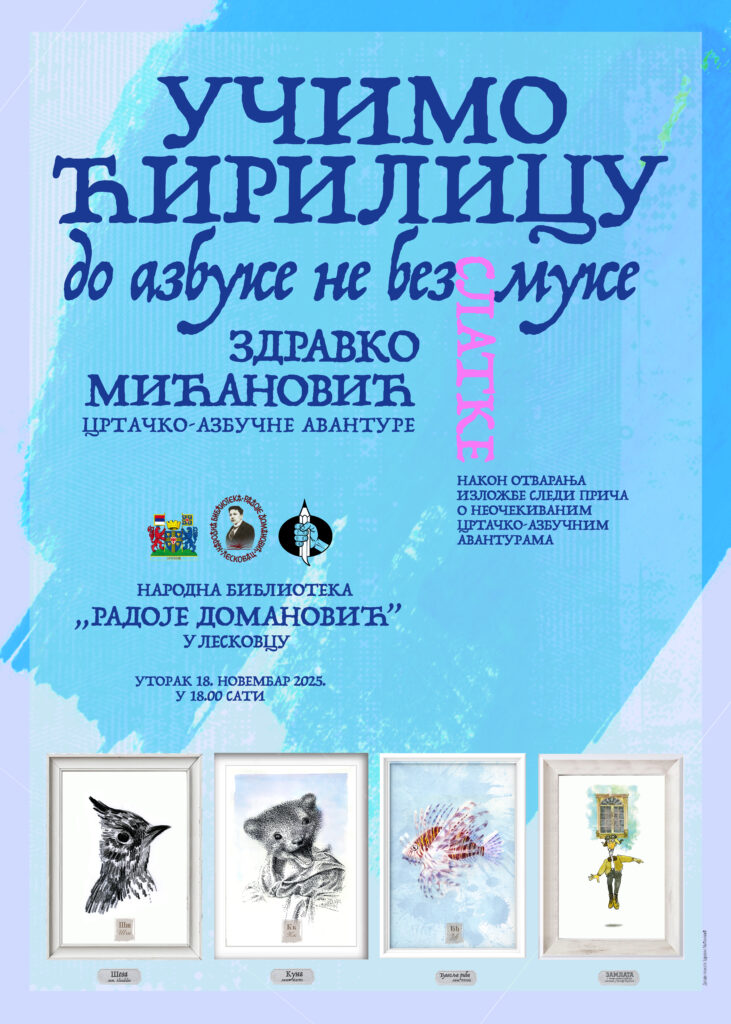 U utorak, 18. novembra 2025. godine u 18.00 sati Narodna biblioteka „Radoje Domanović“ u Leskovcu, u saradnji sa Školom stripa „Nikola Mitrović Kokan“, organizuje otvaranje izložbe „Učimo ćirilicu – do azbuke ne bez slatke muke“ i razgovor „O crtačko-azbučnim avanturama“ Zdravka Mićanovića.
