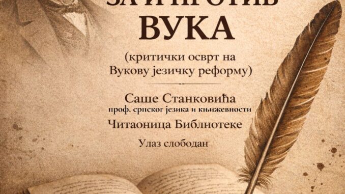 U četvrtak 16. aprila 2026. godine u 18.00 sati, u čitaonici Narodne biblioteke „Radoje Domanović“ u Leskovcu, u okviru programa „Zavičajnost“, biće organizovano predavanje „Za i protiv Vuka“ (kritički osvrt na Vukovu jezičku reformu) Saše Stankovića, prof. srpskog jezika i književnosti.