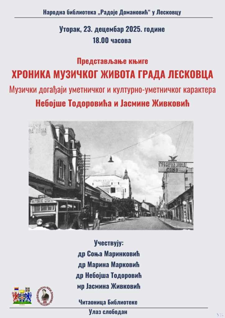 U utorak, 23. decembra 2025. godine u 18.00 sati Narodna biblioteka „Radoje Domanović“ u Leskovcu organizuje predstavljanje knjige „HRONIKA MUZIČKOG ŽIVOTA GRADA LESKOVCA – Muzički događaji umetničkog i kulturno-umetničkog karaktera“ Nebojše Todorovića i Jasmine Živković.