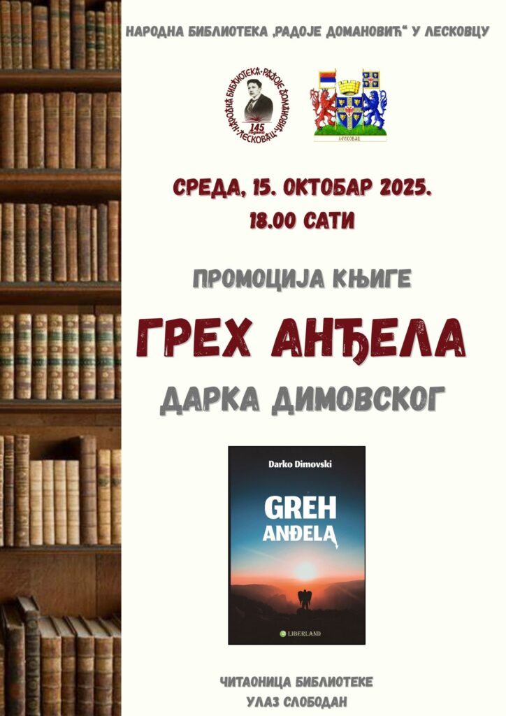 U sredu, 15. oktobra 2025. godine u 18.00 sati, Narodna biblioteka „Radoje Domanović“ u Leskovcu organizuje promociju knjige „Greh anđela“ Darka Dimovskog.
