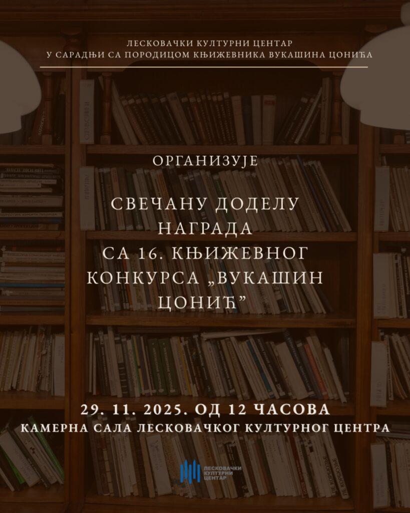 Kao suorganizatori Konkursa za kratku priču „Vukašin Conić”, pozivamo vas da 29. novembra, od 12 časova, u kamernoj sali Leskovačkog kulturnog centra, prisustvujete svečanom uručenju nagrada pobednicima ovog konkursa.